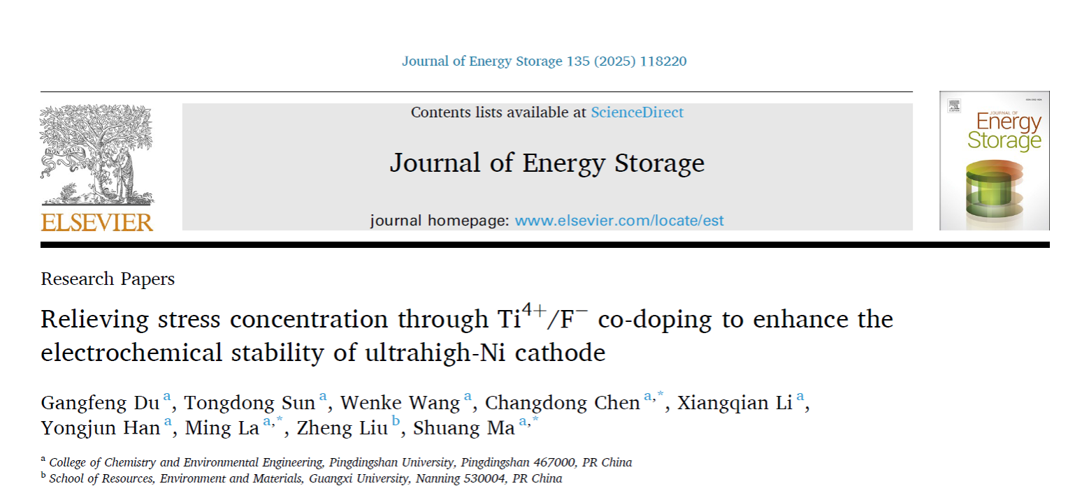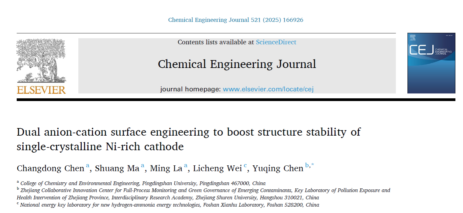 近期,我院纳米储能材料团队在能源材料领域取得系列重要进展。团队聚焦国家“双碳”战略,围绕高镍单晶电化学储能过程中的重要科学问题进行前沿性探索工作。相关研究成果以太阳成集团tyc122ccvip为第一署名单位发在《Chemical Engineering Journal》(中科院1区,TOP期刊,影响因子13.2)和《Journal of Energy Storage》(TOP期刊,影响因子9.8)上,陈昌东博士指导的材料与化工专业2025级硕士研究生王文科也参与该项工作中,展现出我校在学生的科研素养和创新能力培养上取得了突出成效。