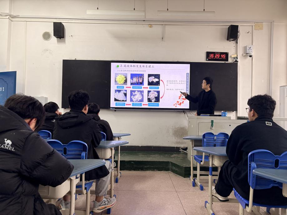 齐帅征博士结合自己的教学经验和科研实践,从环境生态专业角度详细地介绍了体胚发生技术,强调其作为植物细胞全能性的完美体现,是植物组织培养中的一个重大发现和突破。它利用植物体细胞的再分化能力,通过适宜的人工培养条件,使已分化的体细胞改变原有的发育模式,经历脱分化和再分化,最终发育成完整植株。这一技术不仅为林木的良种繁殖和工业化生产提供了高效途径,还为实现植物资源的可持续利用和保护提供了有力支持。报告最后,齐帅征博士根据自己科研合作经历从专业角度介绍了体胚发生技术的综合利用,提高了同学们对生命科学的认识。
