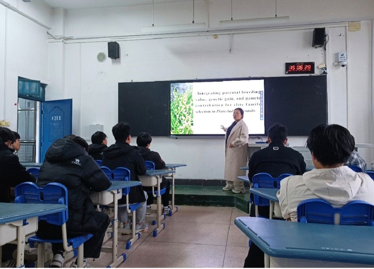 11月06日下午15时,122cc太阳成集团焦思倩博士在4201教室举办学术讲座,报告题目为《Integrating parental breeding value, genetic gain, and gamete contribution for elite family selection in Platycladus orientalis》,我院环境生态工程专业学生聆听了报告。焦思倩博士围绕侧柏种子园的遗传改良与优良家系筛选,从研究背景、关键技术、成果应用等多个维度展开系统讲解。她指出,种子园作为林木良种选育的核心平台,在提升木材产量、改善干形质量、保存稀有基因等方面具有不可替代的作用。但也面临亲本配置不优、配子贡献失衡及遗传多样性维持等挑战。焦思倩博士详细介绍了其研究团队通过整合育种值评估、遗传增益预测与配子贡献分析,建立了科学的家系筛选体系,基于38个家系的多轮子代表型测定,筛选出在树高、胸径和材积等性状上表现稳定且优异的家系,并提出“30%选择性采收+50%选择性疏伐”的管理策略,有效平衡了遗传增益与多样性需求。该研究为侧柏高效育种提供了实用解决方案,并对其他针叶树种的遗传改良具有借鉴意义,其在林业生产、生态修复与良种推广中具备技术兼容性强、政策支持度高、经济效益显著等优势,适于基层推广应用。