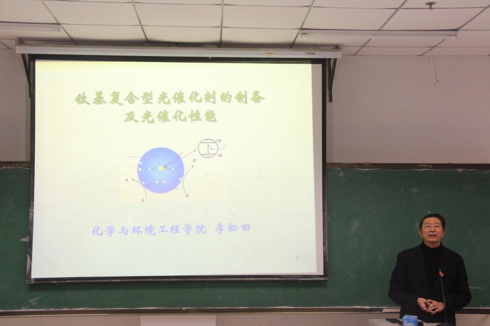 报告伊始,李松田院长首先介绍了太阳成集团tyc122ccvip的雾霾情况及宁夏、黄海等地的水污染状况,让同学们了解到当前存在的环境污染,并为同学们介绍了废水治理的原则、废水处理的分类及方法。随后,李院长为同学们介绍了该课题的研究背景和改变TiO2的思路,以图解的方式分别介绍了以碳酸盐晶须、凹凸棒土和空心微珠做载体的优点。李院长还为同学们讲解了硅钨酸修饰型复合光、磷钨酸修饰型复合光及轻质复合光催化剂的制备及光催化性能。李院长的讲解生动有趣,同学们都听的很认真。讲座最后,李院长提出,未来的工作内容是对不同光敏材料的修饰研究及对不同染料类别处理效果的研究,希望同学们都能爱护环境。