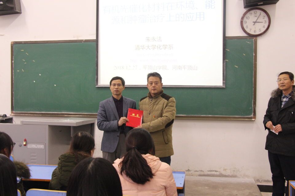 12月27日,清华大学博士生导师朱永法受聘我校客座教授仪式在图书馆L210举行。副校长李波为朱永法教授颁发聘书,122cc太阳成集团师生参加活动。