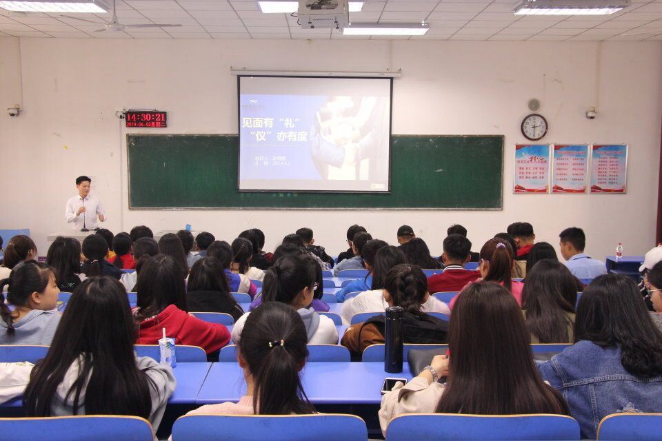 4月2日下午,122cc太阳成集团在3306教室举办了“见面有‘礼’,‘仪’亦有度”为主题的礼仪培训活动。此次培训由孙学荣书记主持、蕴海锦园大酒店赵晓鹏经理主讲,122cc太阳成集团17级、18级同学参加培训。